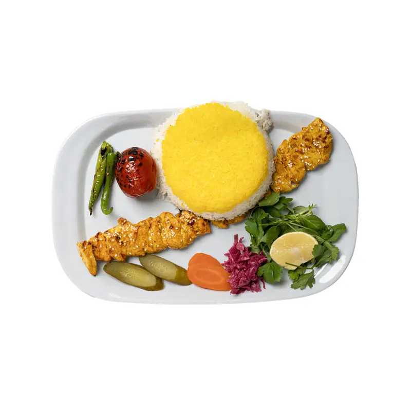 250 گرم فیله مرغ زعفرانی، برنج کته زعفرانی، دورچین