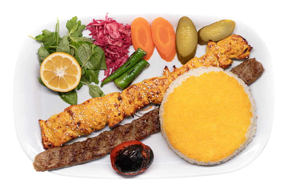 250 گرم فیله مرغ، 120 گرم کوبیده گوسفندی، برنج کته زعفرانی، دورچین
